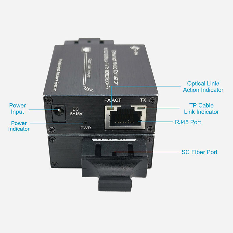 Şu anda iki tür medya ağ bağlantısını destekler: 10Base-T/100Base-TX/1000Base-T ve 100/1000Base-SX/LX,10Base-T/100Base-TX/1000Base-T bükülmüş çiftlerin elektrik sinyallerini 100/1000Base-SX/LX optik sinyallerle birbirine dönüştürmeAğın aktarım mesafesini bakır kablo üzerinden 100 metre'den fiber optik kablolar üzerinden 20 kilometreye (120 kilometreye kadar) uzattı.